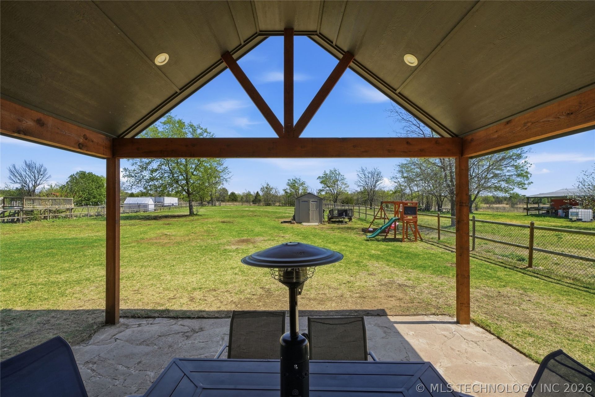 Rare find! Enjoy the perfect blend of space and privacy on this expansive 3/4+ acre lot that backs directly to a peaceful greenbelt. This meticulously maintained 3-bedroom, 2-bathroom home offers a functional layout and ultimate peace of mind with a built-in storm shelter in the 2-car garage. The outdoor living space features a fully fenced yard, an extended patio, and a custom backyard cabana-the ideal setup for entertaining guests or relaxing in your own private retreat. Properties with this much acreage and seclusion are a rare commodity. Move-in ready and waiting for you!