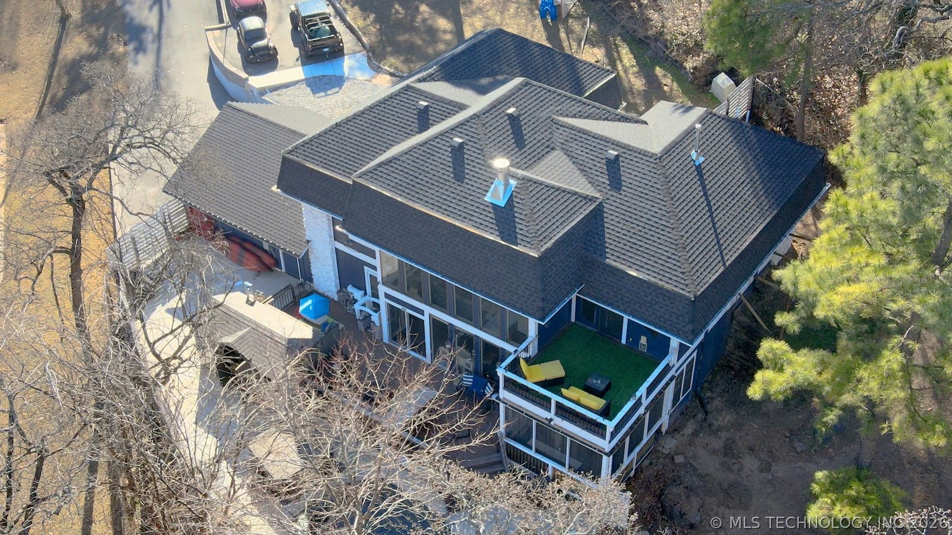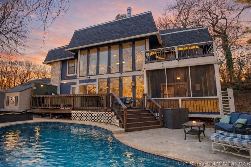 Nature lover's paradise in South Tulsa near 101st & Yale Ave. Jenks Schools. 2,665 sq ft (CH) on 1.05 fenced acres (CH) with no HOA. 3 bedrooms and an over-sized office or 4th bedroom with walk in closet and private screened in outdoor patio, 3 full baths. Tired of the same "ole" house? One-of-a-kind, modernized two-level home with a spacious living room showcasing a custom hanging fireplace with 360 flame view and a wall of scenic windows, creating a mountain-lodge feel. Would be a great Airbnb! Open-concept kitchen with granite countertops communicates seamlessly with the living room, perfect for entertaining or everyday living. Relax in your spa-like primary suite with soaking tub, generous tiled shower, laundry area, and balcony with turf flooring & peaceful views. Outdoor living features Trex deck with built-in TV area, hot tub, and swimming pool masoned in the ground. Also features huge walkable attic with 2 access points & electric, finished garage with climate-controlled heat/air and epoxy floors, second driveway with RV hookups, and two storage sheds. New roof, gutters, and upstairs smart Eco HVAC (2025)..