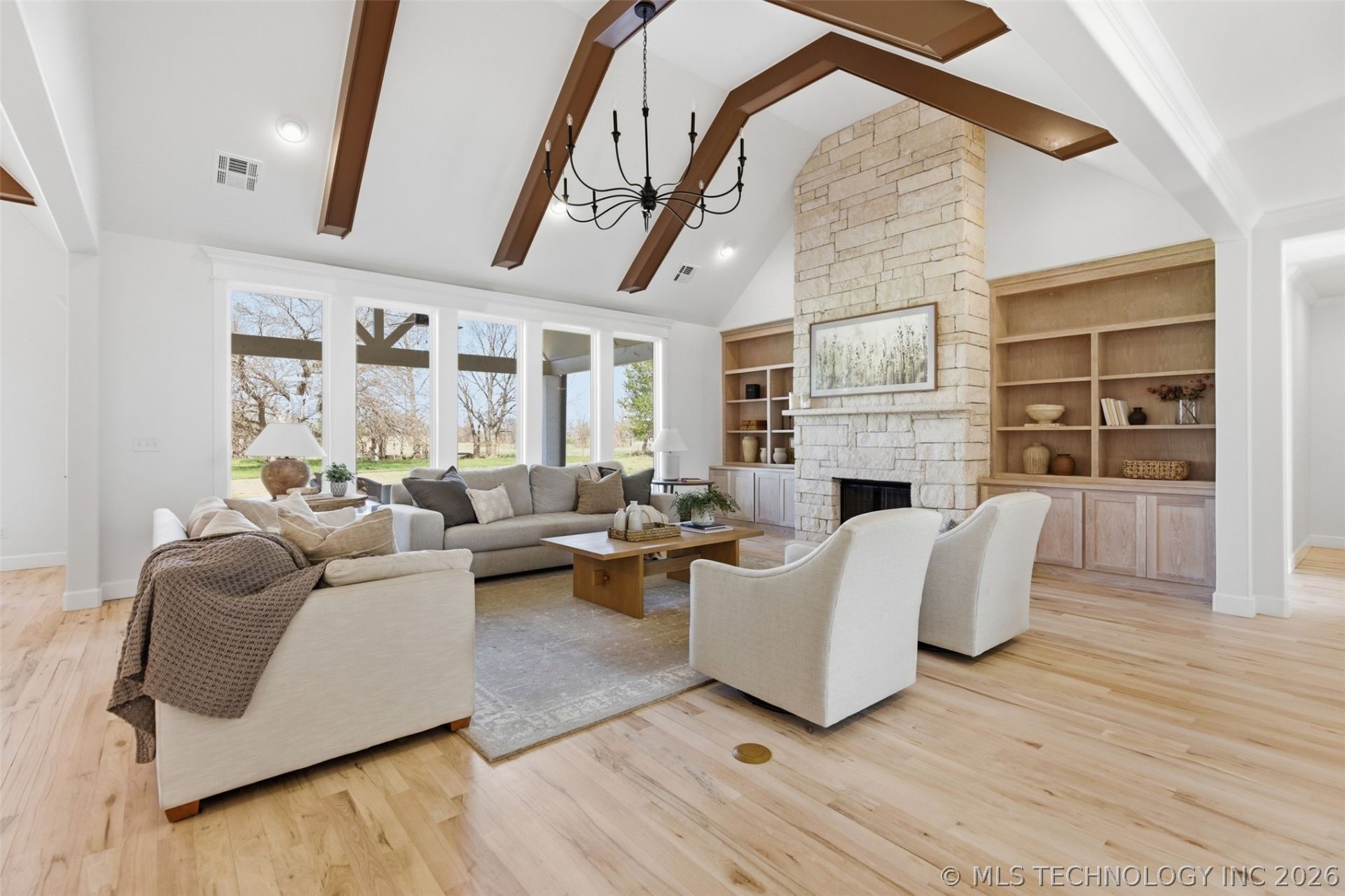 Discover luxury and modern design in this stunning contemporary home built in 2025, featuring custom upgrades throughout that will leave you in awe from the moment you drive up the 70 yard driveway and walk through the front door or this gorgeous home. Thoughtfully designed with both elegance and functionality in mind, this beautiful home offers 4 spacious bedrooms and 3 full bathrooms with exceptional craftsmanship and detail in every room. The expansive great room is the heart of the home, showcasing a breathtaking floor-to-ceiling full stone fireplace with gas logs and a wood mantle, creating a warm and inviting space perfect for relaxing or entertaining. The chef's kitchen is equally impressive with gorgeous granite countertops, stainless steel appliances, a large center island, built-in range with full tile backsplash, pot filler, and a cozy eat-in breakfast nook. Just down the hall, you'll find a dedicated office featuring vaulted ceilings, wood beam accents, and custom built-ins, ideal for working from home. The home also includes a spacious game/rec/TV room with vaulted ceilings and matching wood beam accents, providing the perfect spot for entertainment or family gatherings. The luxurious primary suite offers vaulted ceilings with wood beam accents and a spa-like master bath complete with a garden soaking tub, separate shower, and a large walk-in his and hers closet. Additional highlights include: Third full guest bathroom, Mudroom with built-ins for everyday convenience, Large utility/laundry room with abundant cabinetry and folding counter, Covered back patio with gas stub for BBQ, Programmable thermostat, Attached 3-car garage with anchored Storm Shelter All of this is nestled on a beautiful 0.97-acre lot and on the end of a cul-de-sac, offering the perfect balance of privacy, space, and luxury living. This exceptional property truly has everything you've been searching for. Call to schedule your private showing and experience it for yourself!